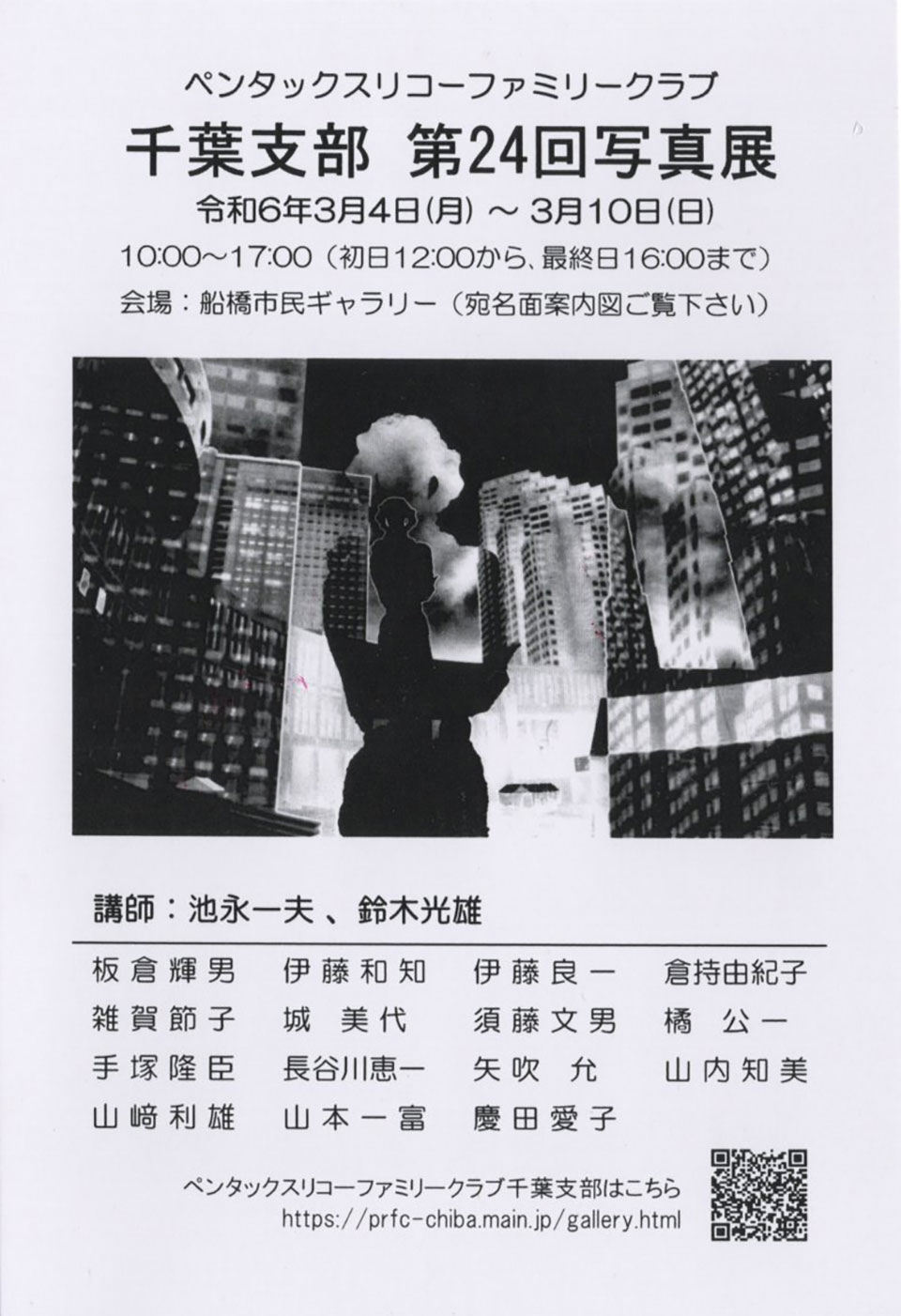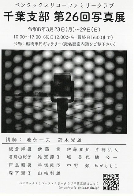 今回でなんと、第24回目を迎える、ペンタックスリコーファミリークラブ千葉支部写真展。 本日から3月10日(日)まで、船橋市民ギャラリーで開催いたします。 お時間がございましたら、ぜひお立ち寄りください。 日時: 3月4日(月)~3月10日(日) 10~17時(初日は12時から、最終日は16時まで) 会場:船橋市民ギャラリー(船橋スクエアビル3階) ![]() |